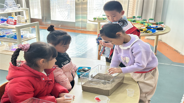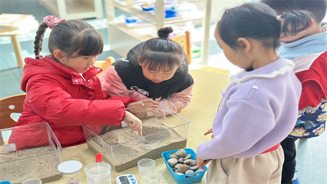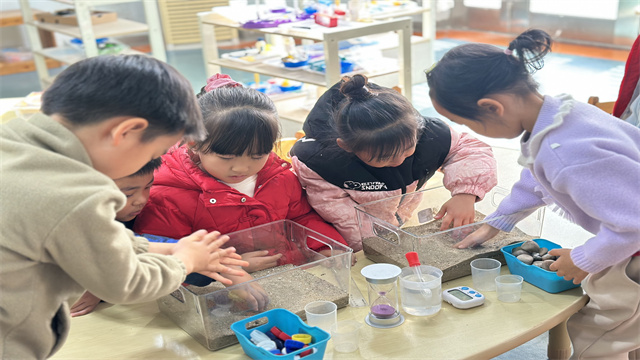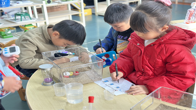 活动中,幼儿以小组为单位,在透明容器内铺设等量沙子,分别在两个“沙坑”中埋入石头与瓶盖作为对比材料,通过量杯精准控制水量,模拟自然降水过程,观察并记录不同材料对沙体排水速度、积水情况的影响。