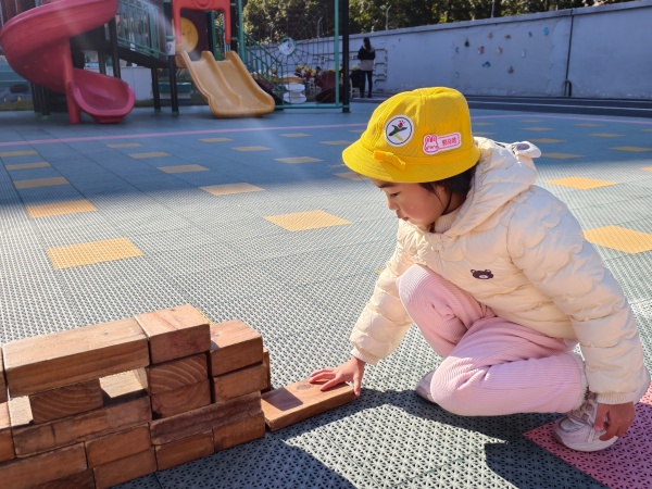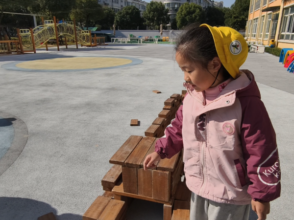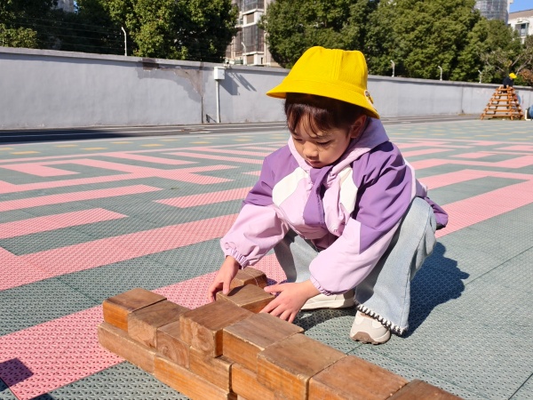 操场上瞬间变成了一个热火朝天的“建筑工地”。孩子们自由分组,默契配合,运用积木开始了他们的“伟大工程”。有的孩子负责搬运“砖石”,有的负责设计搭建,还有的则像个小工程师一样,仔细比对结构是否稳固。他们充分发挥想象力与创造力,将平日里掌握的平铺、延长、围合、垒高等建构技能运用得淋漓尽致。