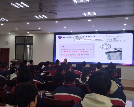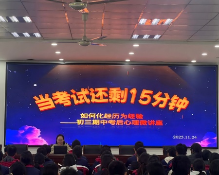 表彰会结束后,学校校心理老师沈菁为九年级学生带来了一场别开生面的考后心理讲座《当考试还剩十五分钟》。讲座通过生动视频引发共鸣,心理老师引导学生从"好笑"的考场经历中探寻"好奇"的心理机制,深入剖析了考试焦虑、决策犹豫等现象背后的原因。通过"478呼吸法"体验、决策技巧训练等互动环节,同学们学会了将考场压力转化为有效行动的策略。整场讲座在轻松活跃的氛围中,帮助学生掌握了心态调节方法,为接下来的学习征程注入了满满心理能量。
