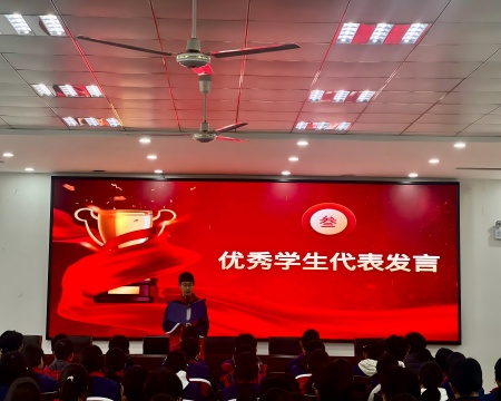 随后,优秀学生代表陆沁辰登台交流学习经验,他将自己如何在半载时光里,把奋斗写成青春的注脚娓娓道来,期间他不断强调他的每一份耀眼的成绩都离不开师恩与亲情的滋养。