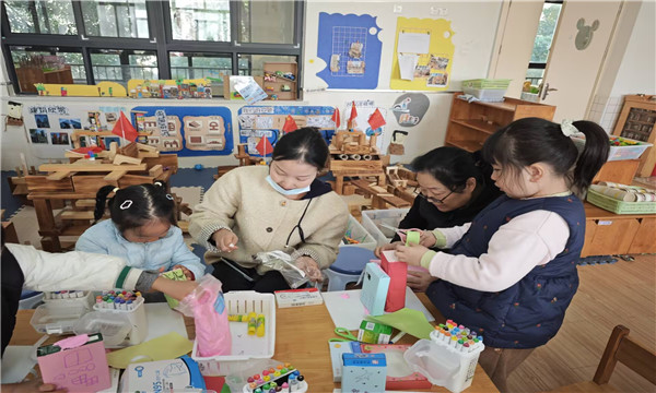 活动的重头戏是“共建纸盒童话镇”亲子手工环节。在党员教师的引导下,各组家庭利用提前收集的废旧纸盒、瓶罐等材料,开始了奇妙的创作之旅。平日里看似无用的牛奶盒、牙膏盒,在家长和孩子们的巧手合作下,被赋予了新的生命。剪裁、拼贴、涂画、装饰……一个个不起眼的纸箱纸盒,神奇地变身为高矮错落、色彩斑斓的童话小屋。整个过程中,党员教师们穿梭其间,耐心指导,鼓励创新,并时刻提醒安全注意事项,充分体现了党员的服务意识与专业素养。