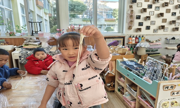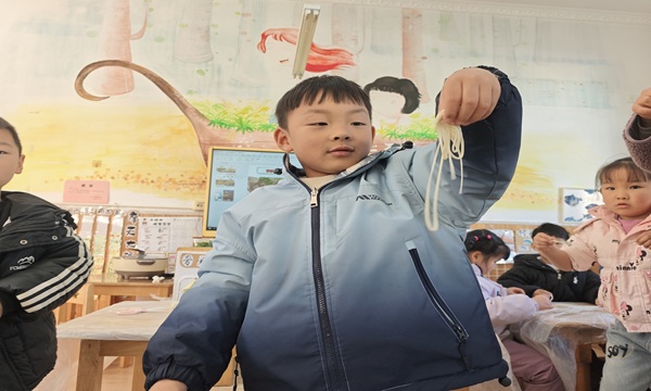 活动伊始,马雅新爸爸亲切地向孩子们问好,并简单介绍了回族的饮食文化。当光滑的面团在他手中经过抻、拉、摔、扣,瞬息间变成千丝万缕的细面时,孩子们瞪大了眼睛,发出了阵阵惊叹。“太厉害了!”“像变魔术一样!”童言稚语中充满了好奇与敬佩。