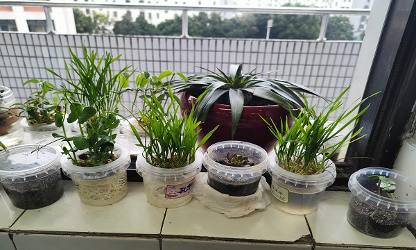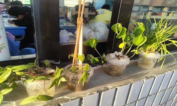 水培过程中,同学们也遇到了不少“小挑战”。五年级(2)班的绿萝出现了根须发黄的情况,大家对着透明培养皿反复观察,有人猜测是营养液太多,有人觉得是光照不够。老师没有直接给出答案,而是引导大家分组实验:一组减少营养液用量,一组调整放置位置增加光照。通过对比观察,同学们发现是营养液浓度过高导致根须受损,及时更换清水后,绿萝的根须很快恢复了洁白。此外,豆芽生长过快倒伏、生菜叶片发黄等问题,也让同学们在查阅资料、反复尝试中学会了解决问题,更深刻体会到植物生长的脆弱与神奇。