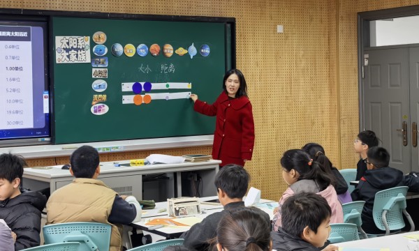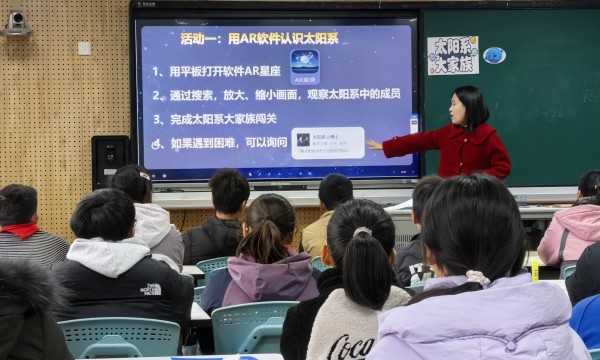 课堂伊始,朱琴老师借助数字人形象引入主题,以生动活泼的语言向学生们抛出问题,瞬间点燃了学生的参与热情。随后,教师通过谈话互动的方式,细致了解学生对太阳系的已有认知,梳理出大家普遍好奇的疑问,为后续针对性教学奠定基础。在自主学习环节,《AR星座》软件的应用让课堂焕发新活力。学生们通过操作设备,置身于虚拟的星空场景中,直观观察太阳系各行星的形态、运行轨迹等特征。同时,结合闯关任务,学生们主动查阅相关信息,在完成任务的过程中系统掌握了太阳系成员的核心知识,学习积极性显著提升。课堂最后,教师引导学生围绕太阳系中八大行星的相关数据,开展“画一画、剪一剪、摆一摆”的实践活动。学生们在动手实践的过程中深刻理解了八大行星的大小差异和距离关系,将抽象的科学知识转化为直观的认知。