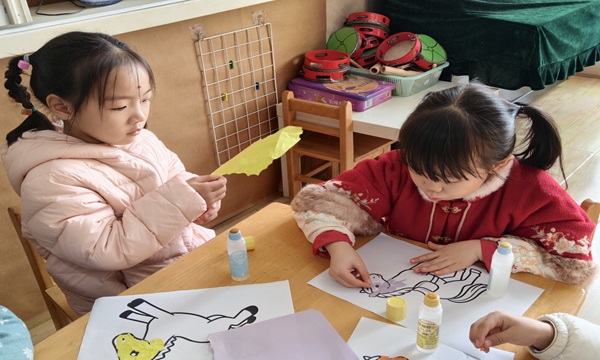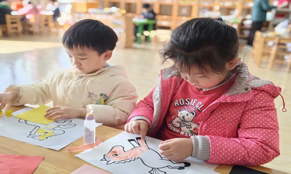 活动现场暖意融融,孩子们围坐在桌前,专注地拿起彩纸、胶水,将碎纸片一点点粘贴在画稿上。有的孩子选择明亮的黄色装饰小马的鬃毛,有的用粉嫩的色块拼接出可爱的马身,还有的搭配了花纹贴纸增添细节。活动室里不时传来讨论声:“我的小马要加翅膀!”“这个红色纸片贴尾巴会更漂亮!”从构思到动手,孩子们全程投入,稚嫩的小手下渐渐浮现出一个个鲜活的作品。