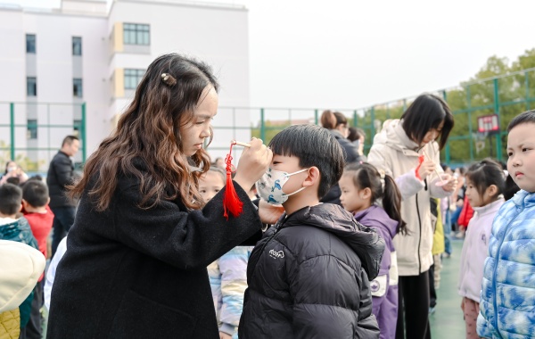 紧接着的“朱砂点痣”环节,将活动氛围推向高潮。一年级教师手持蘸满朱砂的笔,逐一为孩子们在额头正中点上红痣。“朱砂点破,智慧照亮,愿你眼明心亮,好读书、读好书!”伴随着美好祝愿,一颗颗鲜红的“智慧痣”在孩子们的额头绽放,既延续了古代启蒙教育的传统习俗,也寄托了学校对“梅好学子”的殷切期盼。