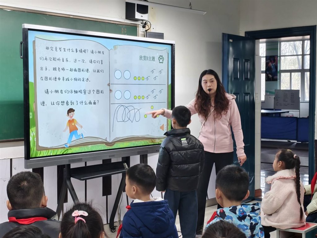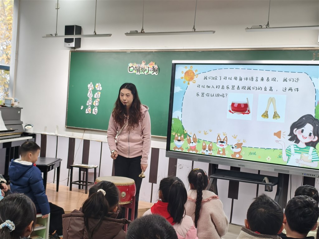 活动开场,卢老师带来了示范课《口哨与小狗》。课堂上,老师以“口哨”这一独特的音乐形式为切入点,通过趣味模仿、节奏拍手等互动方式,带领学生走进欢快的音乐情境。在学唱环节,老师引导学生感受歌曲轻快的旋律与诙谐的歌词,让学生扮演“小主人”和“小狗”,用肢体动作表现歌曲内容,充分调动了学生的参与热情。学生们在角色扮演中体会音乐的节奏变化,在欢声笑语中完成了歌曲学唱。