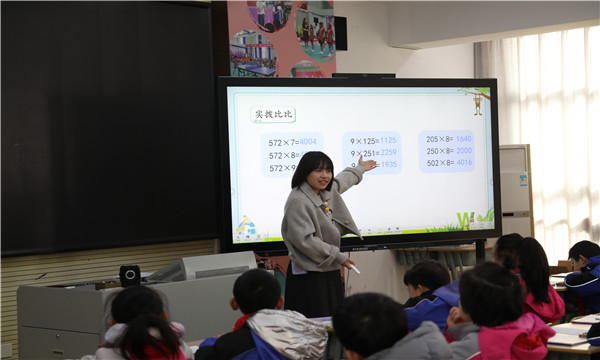 随后,常州市兰陵小学的武丽平老师带来了一节《三位数乘一位数》复习课。武老师独具匠心地将乒乓校本文化融入复习情境之中,同时巧妙地与珠心算文化相融合。在课堂上,她通过一系列有针对性的训练,有效提升了学生的指法熟练度。