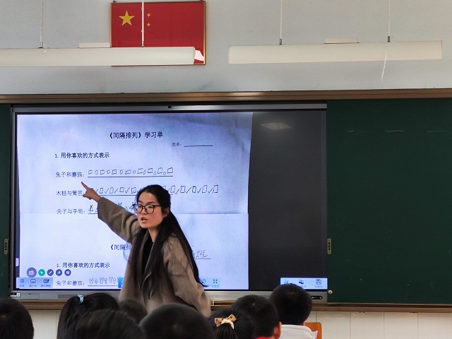 课堂从学生熟悉的生活场景入手,施老师鼓励学生运用图形、数字、字母等多元符号自主表征间隔排列现象,尊重并激活每一位学生的思维个性。针对学习过程中出现的共性困惑与个体理解差异,教师灵活运用错例与正例对比展示、分层资源递进呈现等策略,引导学生逐步辨明“间隔排列”的特点,进而清晰把握“两种物体一一间隔”的核心结构,为规律探究奠定了坚实的认知基础。