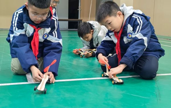 他们小心翼翼地拧紧橡皮筋积蓄能量,调整车轮角度校准方向,有的还在反复测试中优化车身结构,确保小车能发挥最佳性能。这些由硬纸板、木棍、轮轴和橡皮筋组装而成的小车,虽结构相同,却都凝聚着同学们的实践智慧。