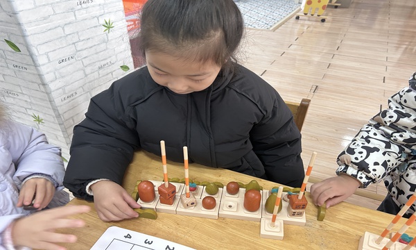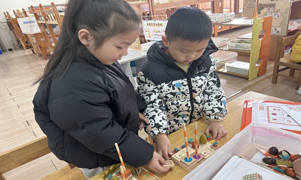 建构区里,一名小女孩专注地将蔬果造型的益咕模块插在木杆上,搭配底座搭出整齐的 “作物架”,小手轻轻调整模块位置,嘴里念叨着 “这是我的农场”。旁边的小男孩原本对着材料卡犯愁,女孩主动凑过去帮忙,两人分工固定底座、叠放彩色圆片,木杆歪了就互相扶住调整,很快搭出带 “摩天轮” 的迷你游乐场,鼻尖沾着细碎的汗珠,脸上却笑开了花。