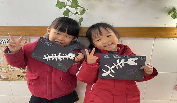 活动之前,小朋友们认识了凶猛的霸王龙、脖子长长的腕龙、憨态可掬的甲龙等多种恐龙的种类之后,对恐龙的兴趣愈发浓厚;紧接着,在绘本、网络资源的拓展支持下,孩子们了解到恐龙化石的相关知识;最后,他们用粘土制作了各种恐龙的骨架,并贴到了揉搓后的牛皮纸上,经过细心的仿旧装饰,一副副刚出土的恐龙化石完成啦。