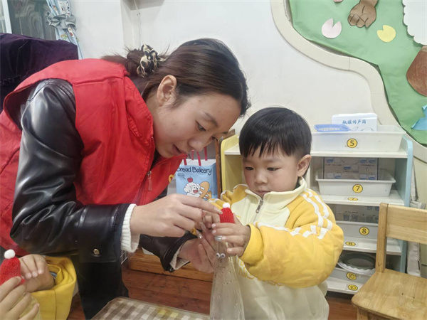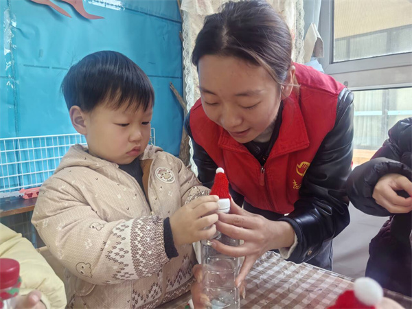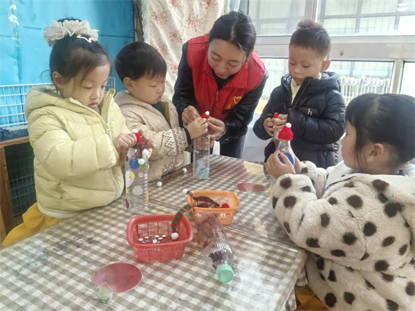 在岁甯妈妈和老师的指导下,孩子们迫不及待地动起手来。他们先给塑料瓶贴上圆圆的眼睛、弯弯的嘴巴,再小心翼翼地为小人戴上漂亮的手工帽子,系上精致的围巾。过程中,有的孩子专注地粘贴装饰,有的孩子兴奋地和同伴分享自己的创意,教室里不时传来欢声笑语。遇到困难时,岁甯妈妈耐心地手把手引导,鼓励孩子们大胆尝试。