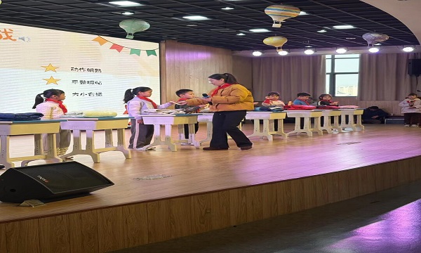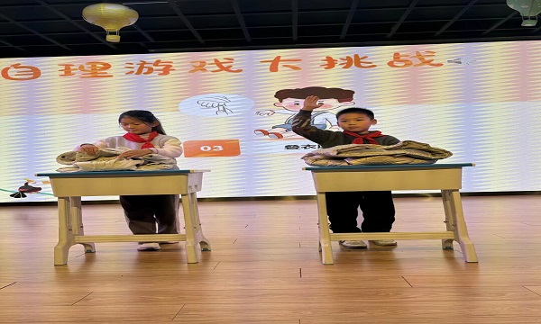 随后,“自理游戏挑战”成为全场焦点。各班选派代表,接力完成“整理书包”、“叠校服”任务。整理书包时,书本分类、文具归位,考验有序规划;叠校服环节,铺平、对折、整理边角,比拼细致耐心。赛场上,选手们争分夺秒又不失严谨,台下加油声、欢呼声交织,在趣味竞技里,让自理技能“熟稔于心、熟练于行”。