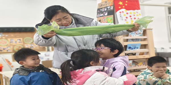 在教师的指导下,孩子们化身“小小科学家”,轮流拿起气球和塑料布在头发上摩擦。“老师,我的头发也跳舞啦!”“快看,纸片被吸起来了!”随着一声声兴奋的欢呼,孩子们发现摩擦后的气球和塑料布不仅能让头发“舞动”,还能轻松吸附桌上的小纸片,原本静止的纸片在静电的作用下轻盈跳动,宛如一个个灵动的小精灵。
