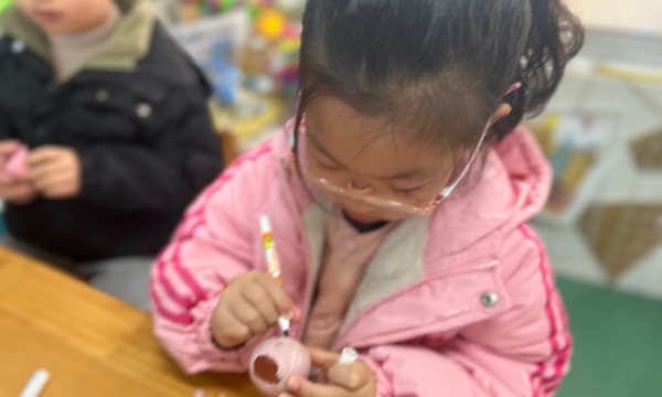 活动中,有的孩子用细头画笔在蛋壳上勾勒线条,小心翼翼地描绘着心中的图案;有的孩子挑选喜欢的颜色,为蛋壳添上鲜艳的色彩。黄色外套的小女孩低头凝神,笔尖在蛋壳上慢慢游走,仿佛在雕琢一件珍贵的艺术品;粉色外套的小朋友则细致地为蛋壳填充颜色,每一笔都透着满满的用心。在孩子们的巧手下,原本普通的蛋壳变成了一个个独具创意的艺术品。
