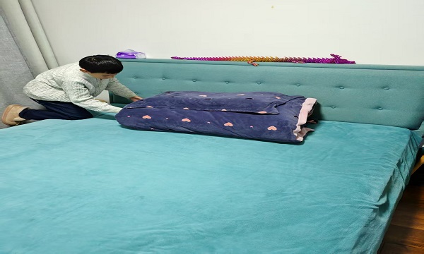 理论学习结束后,实操比拼环节正式拉开帷幕。孩子们以小组为单位,迅速投入到整理收纳的实践中。书桌前,他们有条不紊地将散落的文具归置整齐,把课本按学科分类摆放;衣橱旁,他们学着折叠衣物,将外套、裤子、内衣等分类收纳;床铺上,他们撸起袖子,认真铺平床单、折叠被子,努力复刻“方块被”的标准样式。不少孩子一边操作一边分享自己的小想法:“原来把文具分类放好,找东西这么方便!”“折叠被子看起来简单,实际做起来还需要不少技巧呢!”