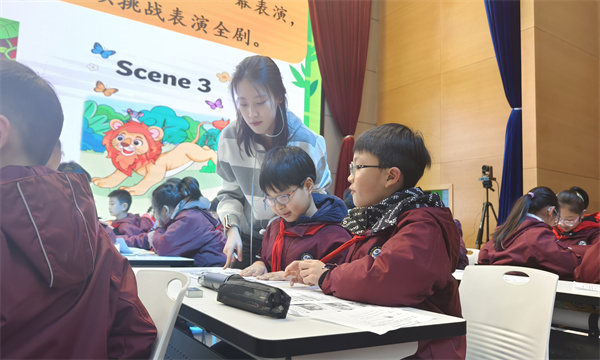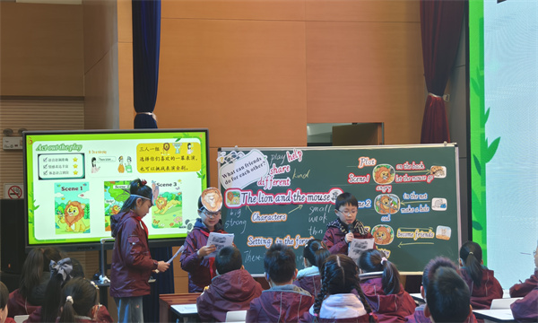 第一节课由常州市局前街小学葛恒老师执教四下《Unit 1 We’re friends》Story time。葛老师围绕戏剧文本的三大要素 Characters、Setting、Plots 展开教学,通过情境创设、互动探究、模仿朗读、剧本修改与戏剧表演等活动,引导学生在真实语境中感知故事情节、学习人物语言、探究人物性格,课堂氛围生动活泼,兼具趣味性与教育性。