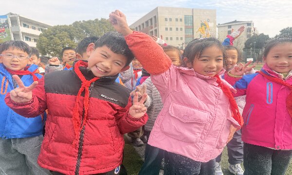 鲜艳的红领巾在胸前飘扬,各色棉服在冬日阳光下熠熠生辉,孩子们眼中闪烁着光芒,脸上绽放着笑容,心中充满了爱——这正是“脸上有笑、眼中有光、心中有爱”的生动写照。