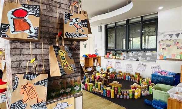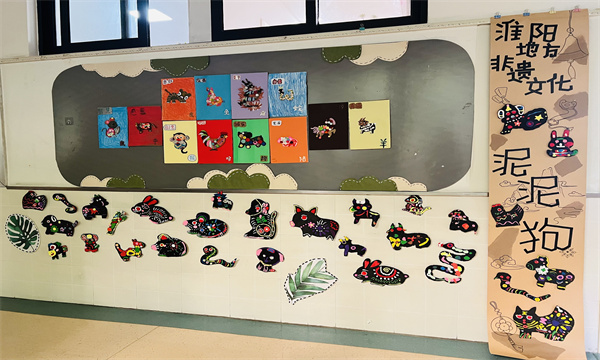 走进大三班的教室,处处可见十二生肖主题的艺术巧思。墙面布置上,淮阳非遗“泥泥狗”主题展区格外醒目,孩子们用彩泥、卡纸创作的泥泥狗造型鲜活灵动,色彩斑斓的作品错落陈列,还原了这一非遗艺术的古朴韵味;剪纸区里,幼儿手持剪刀专注地裁剪生肖纹样,红纸上的鼠、牛、虎、兔等形象在小手中渐渐成型;皮影戏区域摆放着幼儿自制的生肖皮影道具,搭配牛皮纸手绘的生肖主题手提袋装饰,营造出充满传统艺术氛围的游戏场景。