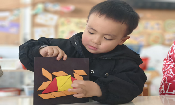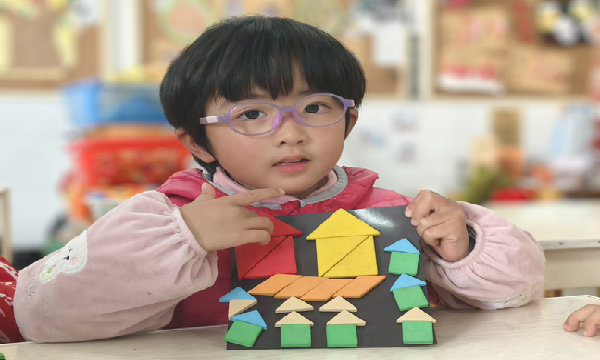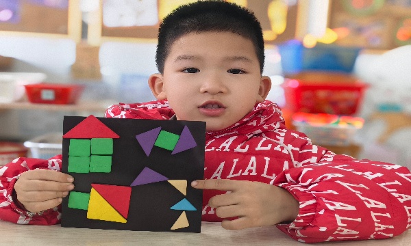 活动伊始,老师为孩子们准备了各种的图形材料,孩子们在轻松愉悦的氛围中认识了基本图形。随后,他们化身“小小魔术师”,自由选择、组合、拼贴,可爱的小脸上满是认真,不时与身边的小伙伴分享自己的想法:“两个三角形拼出了墙,上面放一个三角形就变成了房子,房子前还有小路呢!”“我拼出了小船。”“你看,怪兽!”“老师,你觉得我的挖掘机像不像?”每一幅作品都独一无二,充满了纯真的童趣和大胆的创意。