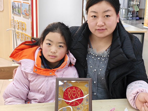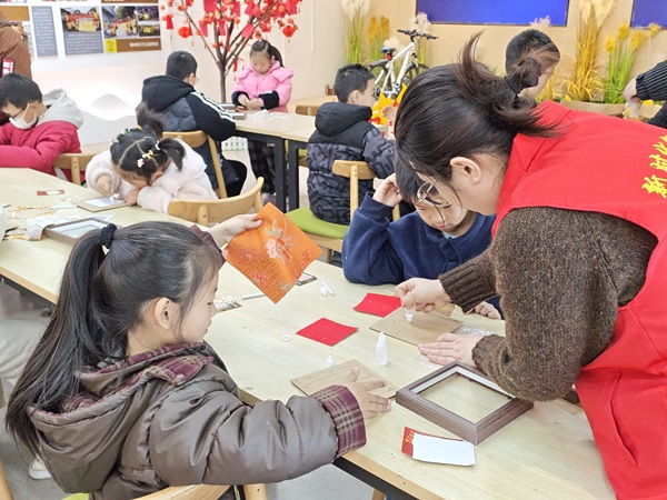 心愿书写环节充满温情,孩子们拿起笔,在心愿卡上认真写下对新年的美好期许。最后孩子们在辅导员的指导下,亲手制作宋锦珍珠画。