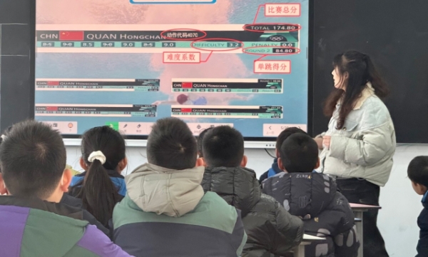 随后张璐老师老师执教了五年级的《数说跳水》。本课以跳水比赛为真实情境,带领学生探索数学在竞技体育中的应用奥秘。课前播放跳水视频,引导学生观察数学信息,自然引出“动作代码”、“难度系数”和“得分计算”三个核心问题。通过真实数据计算、动作代码解析、策略制定三个维度,培养学生运算能力、空间想象力和解决问题的能力,同时感受数学与体育的深度融合,理解学科知识的实践价值。