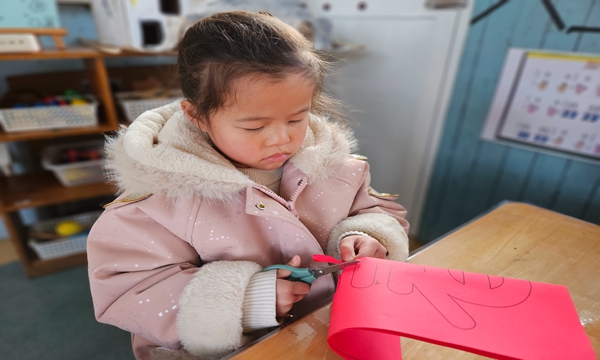 孩子们听得格外认真,小手拿着安全剪刀,跟着老师的步骤慢慢操作。虽然有的孩子是第一次用剪刀剪汉字,偶尔会剪歪线条、剪破边角,但大家不气馁,在老师和小伙伴的互相鼓励下,一点点调整。红纸在小手里翻转,剪刀咔嚓咔嚓作响,一张张普通的红纸,渐渐变成了一个个带着童趣的“春”字。
