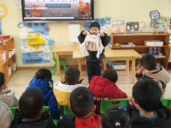 活动中,老师先播放了趣味卡通视频,用小动物雪天出行的小故事,引出雪天安全话题。随后,孩子们纷纷化身“保暖小达人”,主动举起自己的围巾、手套、加绒靴子,兴奋地介绍自己的保暖装备,分享“戴厚帽子不冻耳朵”的小经验。孩子们弯腰翻看自己的鞋底,互相比较花纹的疏密,在老师的引导下发现“花纹多又深的鞋底,踩在雪地上不容易滑倒”。老师还补充演示了触摸户外金属栏杆的小实验,让孩子们直观感知低温风险,牢记雪天安全禁忌。