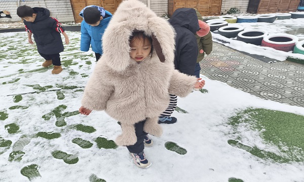 在老师的带领下,孩子们首先观赏雪花,他们伸出小手捧起住飘落的雪花,好奇地观察它精美的形状,直到它在掌心化成小水滴。接着,大家兴奋地走进柔软的雪地,用力踩下小脚印,聆听脚下传来“咯吱咯吱”的清脆声响,每一张笑脸都写满了新奇。