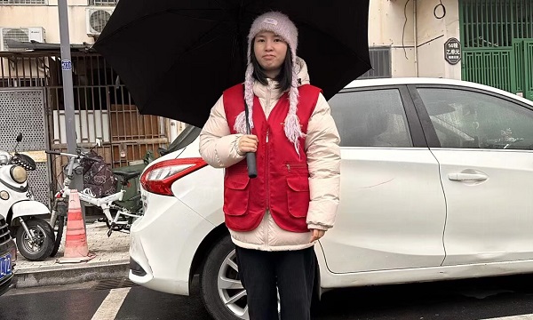 大二班家长身穿志愿者马甲,她们在湿滑的路面上有序引导车辆、护送学生,细心提醒孩子们注意脚下安全。寒风冻红了双手,但她们始终面带微笑,目光专注地守护着每一个过马路的孩子。