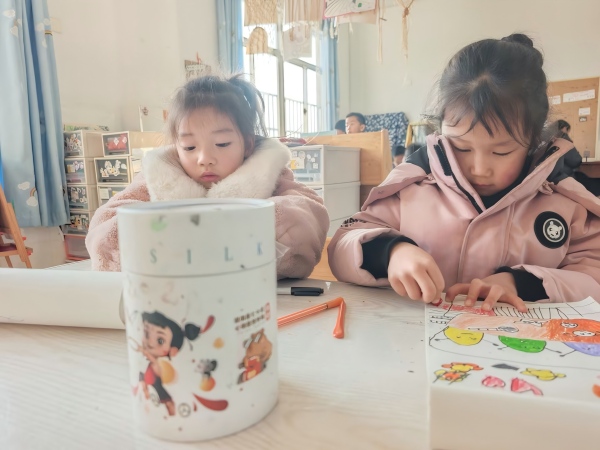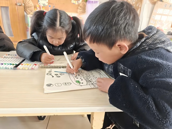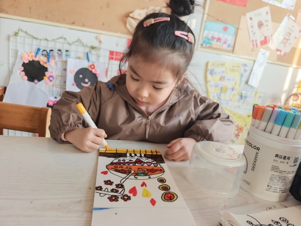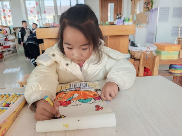 “我要画一个超级大的碗!”“我的腊八粥是彩虹色的!”创作环节,孩子们迫不及待地拿起画笔,在纸上勾勒出碗的轮廓。红色、黄色、绿色……小小的手掌握着画笔,仔细地为“食材”涂上颜色。有的孩子将红豆画得又大又圆,有的给红枣添上了笑脸,还有的在自己的作品旁画上了一家人围坐喝粥的场景。“看,我的腊八粥在冒热气!”五岁的乐乐指着画纸上用白色颜料勾勒的缕缕“热气”骄傲地说。六岁的朵朵则在画面角落认真写下了“腊八”两个字,笔画稚嫩却一笔一画格外认真。