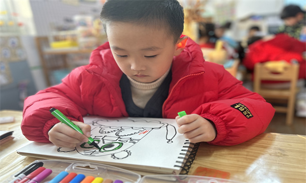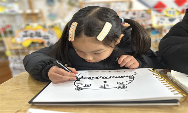 活动中,教师通过图片、视频生动讲解虎头帽的民俗寓意与造型特点,引导幼儿观察虎头的花纹、色彩搭配。孩子们发挥想象力,用画笔勾勒虎头轮廓,以红、黄、黑等鲜艳色彩点缀花纹,有的添上灵动的大眼睛,有的设计别致的纹路,一个个威风又可爱的虎头帽在笔下诞生。