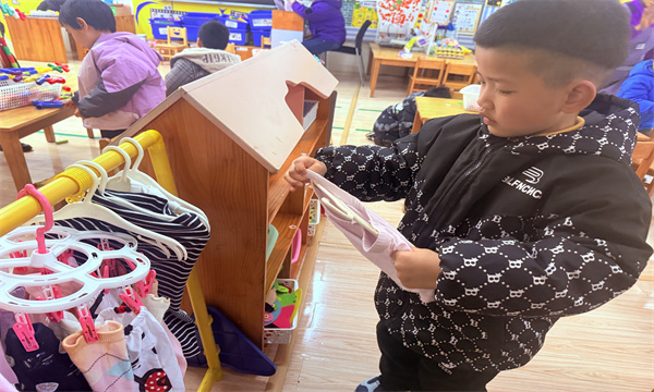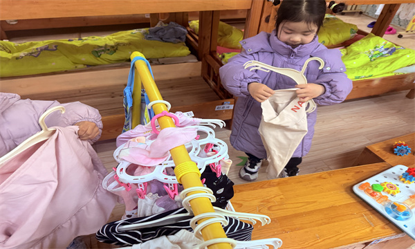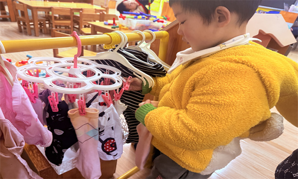 活动现场充满了欢声笑语,孩子们互相观察、互相模仿,遇到困难时会主动向老师求助,也会学着帮助身边动作慢的小伙伴。“老师你看,我的衣服挂好啦!”“我会用夹子啦!”孩子们兴奋地向老师展示自己的成果,成就感满满。看着一件件色彩鲜艳的小衣服整齐地挂在晾衣架上,孩子们的脸上都露出了自豪的笑容。