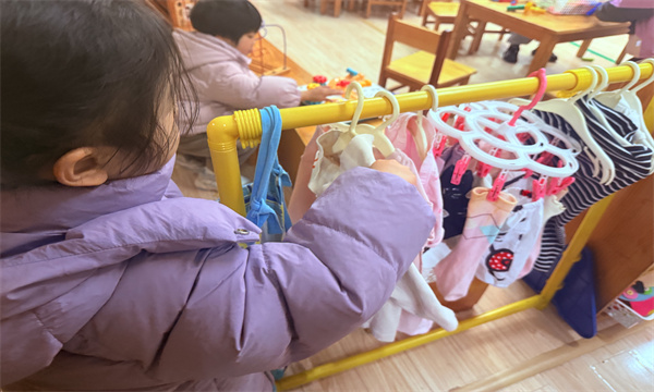 拿到自己带来的小衣服后,孩子们立刻投入到游戏中。有的小朋友小心翼翼地把衣服展开,努力将衣架从领口穿进去,小手紧紧抓住衣架两端,慢慢调整衣服的位置,让衣服平整地挂在上面;有的小朋友则专注地摆弄着小夹子,虽然小手还不太灵活,夹夹子时需要反复尝试,偶尔夹子会掉在地上,但他们丝毫没有气馁,捡起夹子继续努力,脸上始终带着认真的表情。