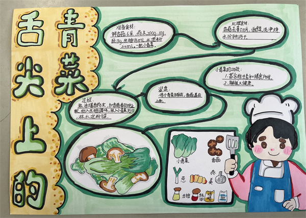 四至六年级学生则化身美食设计师,制作“青菜美食创作书/手账/食谱”,以青菜为主角设计创意菜品,通过绘画搭配文字的形式,细致描绘菜品外观、食材搭配与制作步骤,将农耕收获与美食创意巧妙结合。