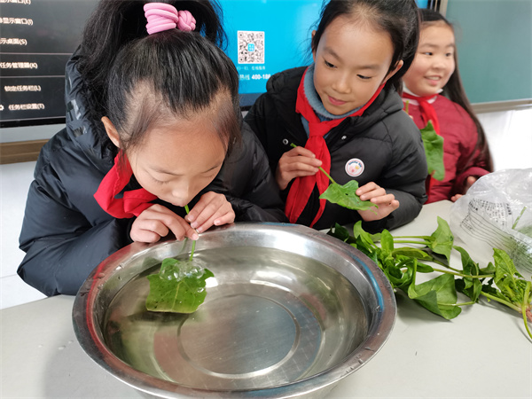 在“植物生长的奥秘”科学实验中,三至六年级学生化身小小科学家,以班级为单位开展趣味实验。豆苗走迷宫,学生用鞋盒搭建迷宫,观察豆苗向着阳光生长的向光性特点;蔬菜会变色,带根青菜浸入有颜色的水中,观察颜色如何被运输到叶片;蔬菜吹泡泡实验里,学生将叶片放进水中,从叶柄吹气,叶片周围泛起的泡泡直观展现了植物气孔的作用。同学们或录制实验视频,或撰写图文并茂的实验报告,用简洁的语言阐释实验背后的科学原理,在动手实践中解锁植物生长的奥秘。