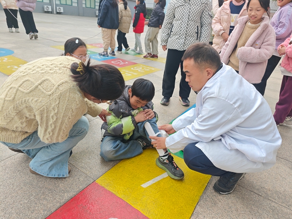 “哎呀!”大课间操场的一声惊呼,打破了校园的宁静。一名学生在游戏时不慎摔倒,表情痛苦地抱着小腿,无法站立。这一突发状况,正是本次应急演练的“开场”。班主任教师迅速反应,第一时间赶到学生身边,轻声安抚其情绪,并仔细查看伤情。与此同时,学校保健老师火速赶到现场,凭借专业知识,对学生的伤处进行初步判断,疑似小腿骨折。保健老师立即采取急救措施,用夹板对受伤小腿进行固定,整个过程动作规范、沉着冷静。