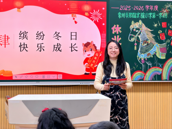 表彰环节聚焦“榜样引领”,学生成长中心田艳玲主任宣读优秀学生名单,获奖代表登台领奖,一张张奖状不仅是对努力的肯定,更传递着学校“以优促优、共同进步”的育人追求。大队辅导员丁莉老师介绍的寒假活动计划,以“智慧马”“才艺马”等六大主题为载体,有机融合常州本土文化、AI创新实践与劳动研学,将“知行合一”育人理念落到实处,引导学生在多元实践中增长本领、感知温暖。