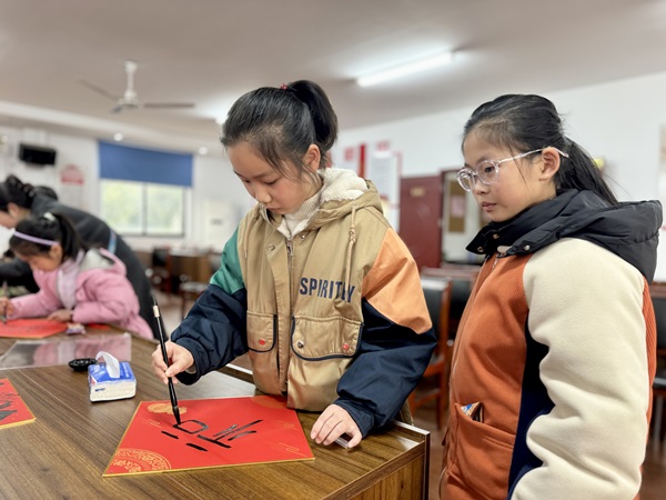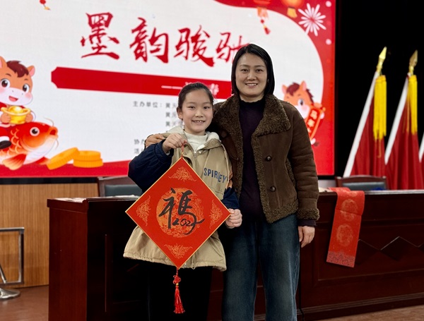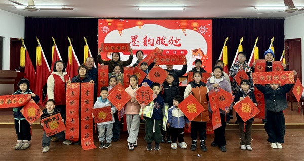 在“瓶猎骏福”竞赛游戏环节,孩子们滚动矿泉水瓶,目不转睛地盯着滚动的水瓶,期盼它能停在“福”处。每当有人成功赢得“福”字,现场便会响起热烈的掌声。紧接着的“墨韵骏驰”环节,五老志愿者悉心指导孩子们书写春联,孩子们发挥创意,自行创作祝福语,一幅幅春联饱含着对新年的美好祝愿。