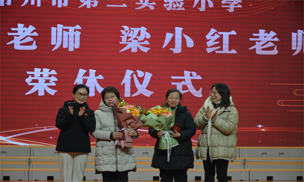 会议现场,一场温馨庄重的教师荣休仪式悄然启幕,两位为学校奉献三十余载的教育前辈,正式告别耕耘半生的三尺讲台。工会代表全体教职工,向荣休教师梁小红老师、陆轩老师敬献鲜花与敬意。老师们深情追忆她们执教生涯的点滴过往:从青丝到白发,从青涩到沉稳,她们将最美好的青春年华奉献给了二实小,用言传身教诠释着师者仁心,用坚守担当书写着教育忠诚。两位荣休教师分享了三十余载从教感悟,字里行间满是对教育事业的赤诚眷恋,以及对二实小未来发展的殷切祝福。全场掌声经久不息,叶校长代表全体师生致敬这份“捧着一颗心来,不带半根草去”的教育情怀,勉励大家让二实小“三千精神”在马年新岁的序曲里,深深扎根在校园的沃土之中、滋养每一位教育追光者。