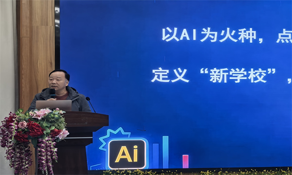 随后,刘参校长围绕《以AI为火种 点燃新学习 定义新学校 创见新未来》主题,为全体教师带来了一场兼具思想深度与实践温度的新学期智慧分享,为即将开启的教育教学之路注入了新的思考与力量。分享中,刘校长旁征博引,以名人名言为引,启迪教师们深耕教育初心、勇担时代使命。他引用凯文·凯利的箴言:“AI时代人的价值不在于完成任务,而在于承担责任”,深刻阐释了在科技飞速发展的当下,教育者应坚守的价值坐标——AI可以替代机械的任务,却无法替代教育者的责任与担当、热爱与坚守,这与凯文·凯利所倡导的“人机深度耦合、共促发展”的理念不谋而合,让老师们明晰了在AI浪潮中自身的核心价值所在以及育人的新方向。