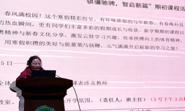 接着,课程部陈婷副部长详细解读了“骐骥驰骋,智启新篇”期初课程方案,从活动意图、时间安排、学科活动内容到注意事项逐一说明。本次期初课程以马年为契机,设计“萌马乐学 智趣闯关”“童心闪耀 艺彩飞扬”“心向阳光 蓄力成长”三大板块,将学科知识与马年文化、冬奥精神深度融合,通过闯关游戏、才艺展示、心理班队课等丰富形式,激发学生学习兴趣,帮助学生快速融入新学期学习生活。