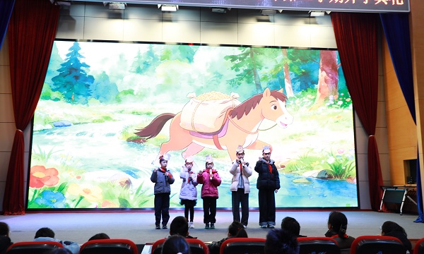 本次开学典礼亮点纷呈,传统文化与时代科技交相辉映。隆重的升旗仪式结束后,低中高年级三组同学带领全体师生探寻马年文化的深厚内涵。低年级同学带来经典寓言《小马过河》,用童真的演绎传递实践出真知的智慧;范煜辰同学讲述《田忌赛马》的故事,解读古人赛马中的谋略与智慧;随后,同学们深情朗诵古文《马说》,感悟千里马的特质与识人用人的道理。一个个生动的故事、一段段饱含深情的朗诵,让师生们在沉浸式体验中,读懂马所象征的勇敢、勤奋与坚守,感受中华传统文化的璀璨魅力,现场不时响起阵阵掌声。
