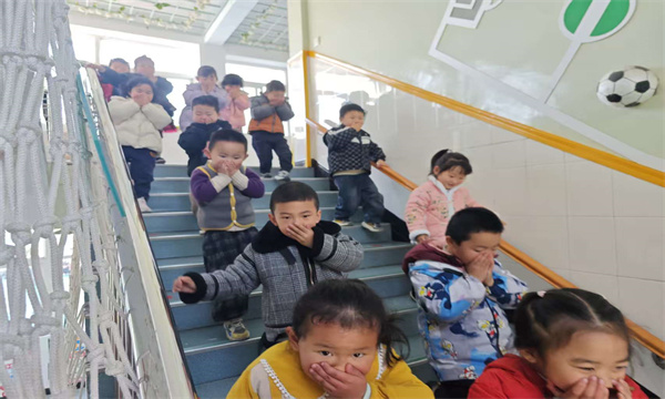随着警报声响起,演练正式开始。各班教师迅速反应,带领幼儿用湿毛巾捂住口鼻、弯腰低姿,沿预定路线有序、快速撤离。各岗位教职工在楼梯口、转角处引导护行,全程紧张有序。全体师幼安全抵达操场集结点后,各班立即清点人数并逐级上报,确保不漏一人、全员平安。
