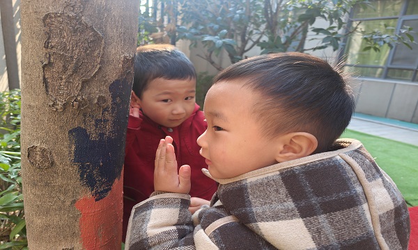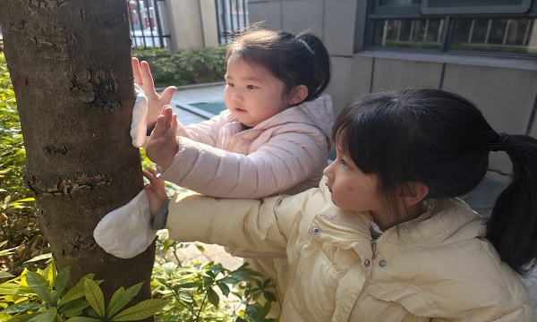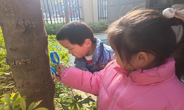 活动伊始,老师带领孩子们来到校园的树木旁,开启了一场奇妙的“树木探秘之旅”。孩子们手持放大镜,仔细观察树皮的纹理,凑近树干倾听树木的“低语”,还和小伙伴们一起比身高、抱大树,用稚嫩的小手触摸、感受树木的生命力,在欢声笑语中认识树木、了解树木的生长奥秘。
