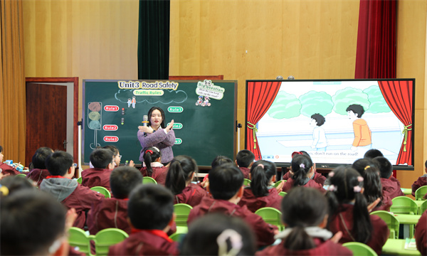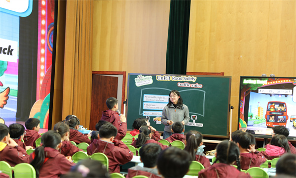 华润小学张宁老师的第三课时进一步延伸,通过《课课练》语篇阅读、Sound time韵律诗拼读、角色扮演等活动,引导学生从“过马路”拓展至“骑行”等多场景安全规则。课堂上,学生在比较、归纳、迁移中不断深化理解,高阶思维能力清晰可见,“思维可见”的理念落地生根。