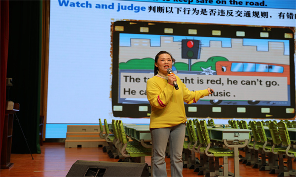 局前街小学杨丽华老师以“争做道路安全宣讲员”为大任务,对第四课时进行说课解读。她通过“打地鼠记词汇”“听力排序练表达”“海报制作促运用”等活动,引导学生在小组合作中从司机、行人、骑行者多视角总结规则。不同层次的学生均有展示机会,人人获得发展,生动诠释了“人人生长”的课堂追求。四节课中,目标、活动、评价环环相扣,所学即所评,所评促所学,“评教一致”贯穿始终。