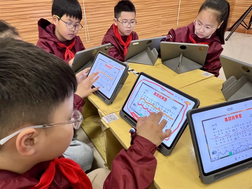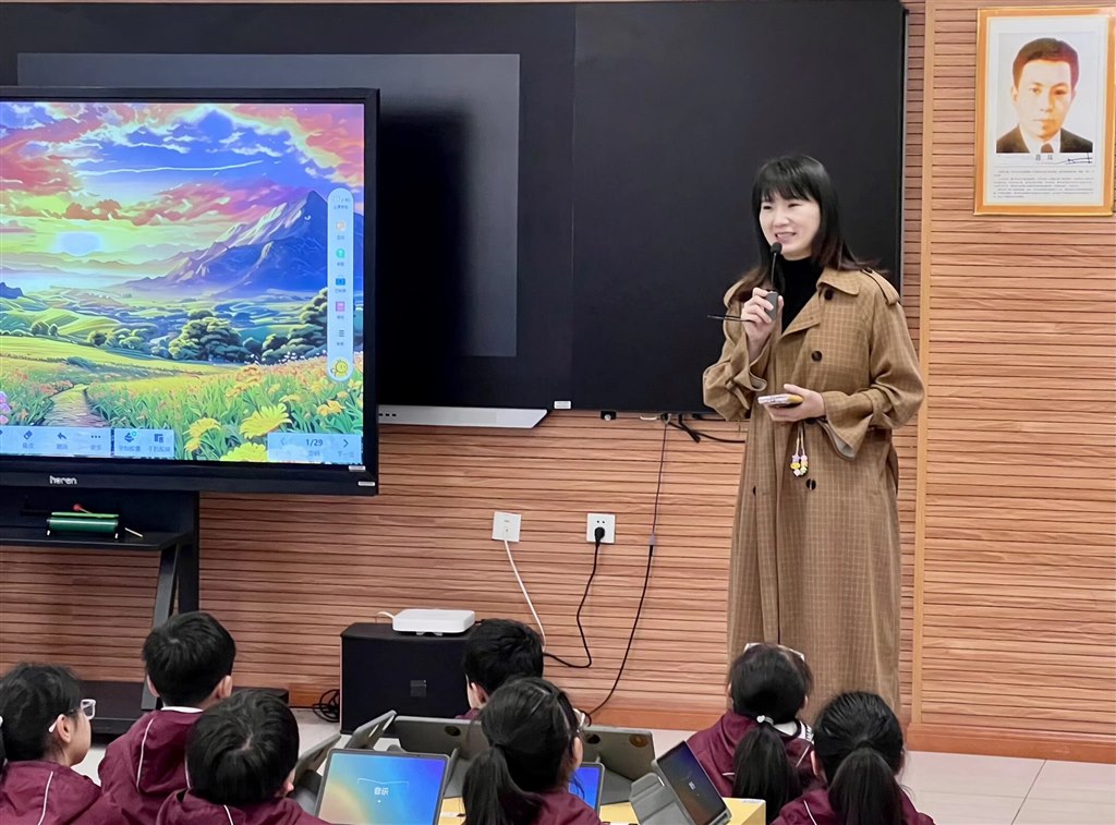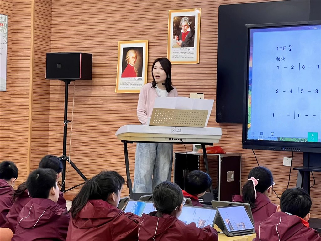第一节是第二实验小学的夏孟颖老师带来的《时光里的歌声》。本节课充分融合智慧教育数字化教学手段,教师依托平板设备开展多元化师生互动,用信息化教学充分调动学生课堂参与积极性。同时课堂设计创意实践活动,引导学生变换演唱队形,在沉浸式队形体验中亲身感知歌曲轮唱的声部层次、韵律美感,在生动的亲身实践中攻克歌唱学习难点,让传统歌唱课堂焕发数字美育新活力。