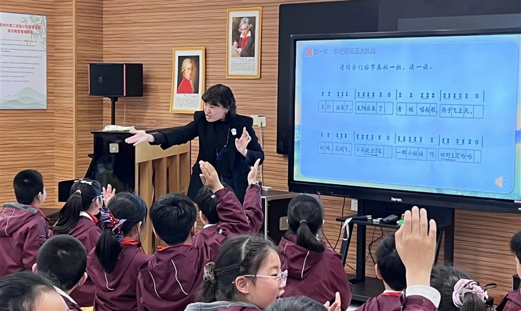 第二节课是红梅实验小学的顾艳老师执教的《太阳出来了》。教师深挖民族音乐文化内涵,精心创设沉浸式民俗教学情境,以潜移默化、润物无声的氛围浸润方式,带领学生走进乐曲背后的文化意境。课堂在旋律感知、演唱实践、文化体悟的层层递进中,巧妙拆解歌曲教学重难点,让学生在文化沉浸中读懂音乐、唱响音乐,精巧的课堂设计收获了在场听课教师的一致好评。